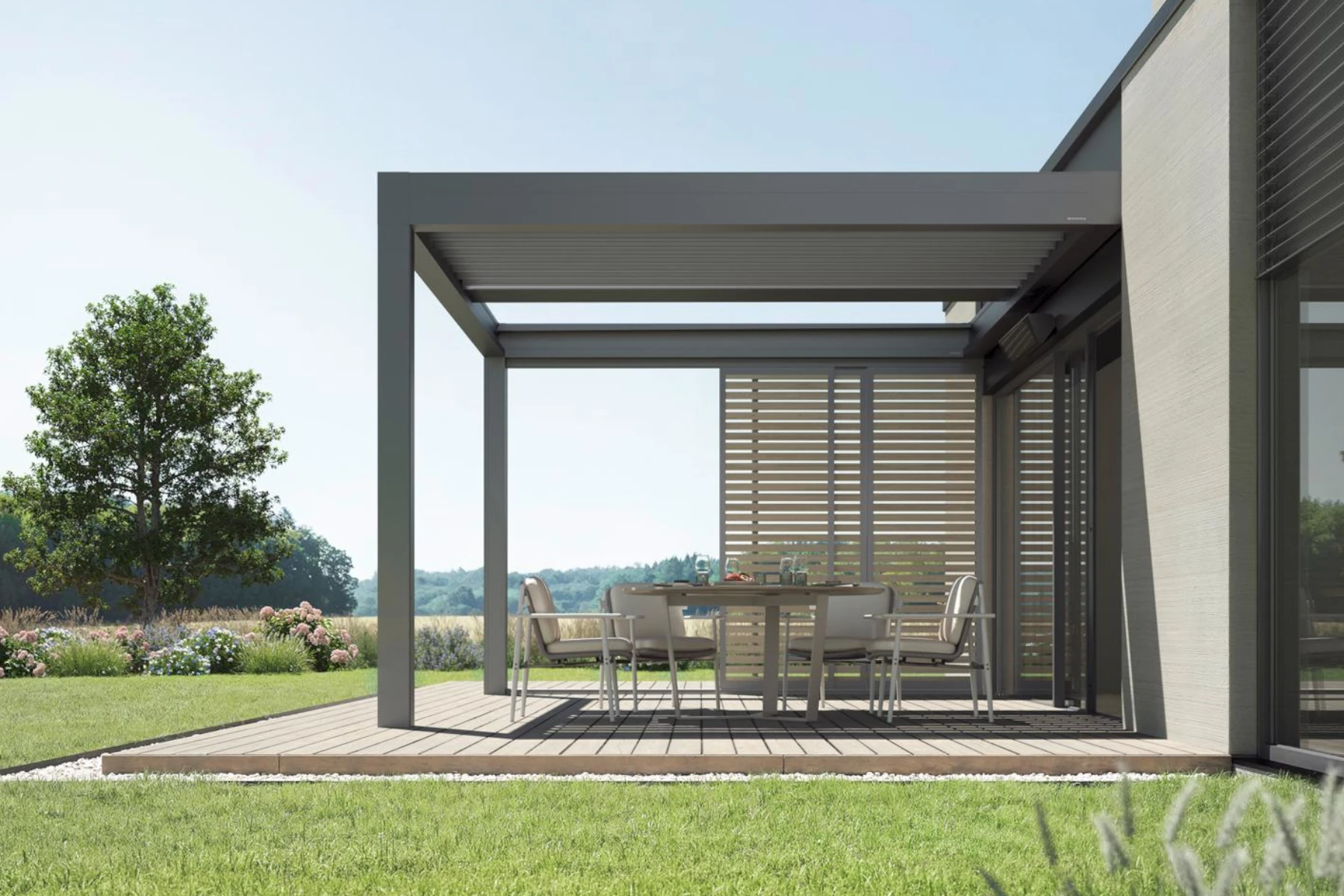 Lamellendächer von Warema vereinen modernes Design mit technischer Raffinesse. Die dreh- oder sogar verfahrbaren Aluminiumlamellen lassen sich je nach Sonnenstand und Wetterlage flexibel einstellen – von lichtdurchfluteter Offenheit bis hin zum komplett geschlossenen, regensicheren Dach.
