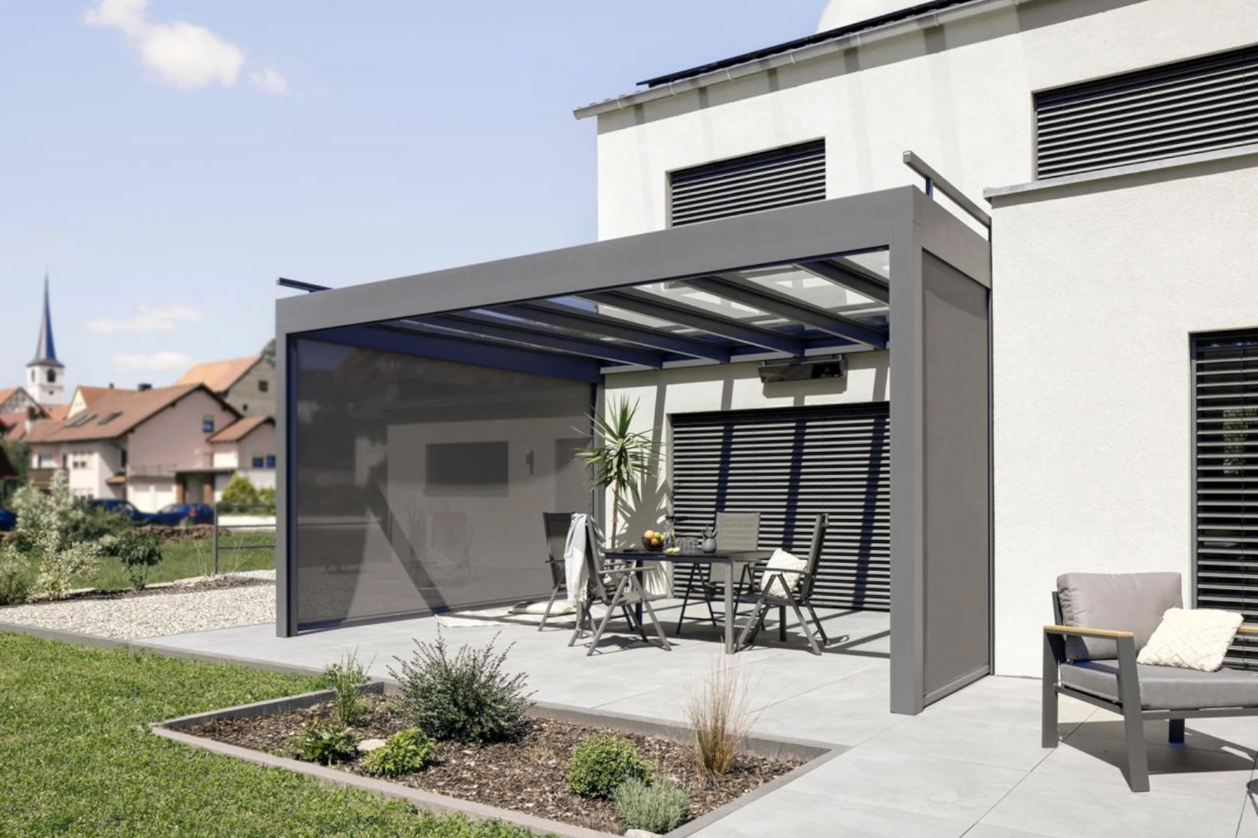 - Optionaler Sicht- und Windschutz durch Schiebeelemente, Senkrechtmarkisen oder Seitenverglasungen